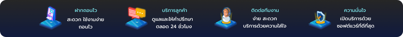 ระบบฝาก-ถอนอัตโนมัติรวดเร็วภายใน 30 วินาที รองรับธนาคารชั้นนำทุกธนาคารและทรูมันนี่วอลเล็ท มีโปรโมชั่นต้อนรับสมาชิกใหม่และกิจกรรมแจกเครดิตฟรีอย่างต่อเนื่อง